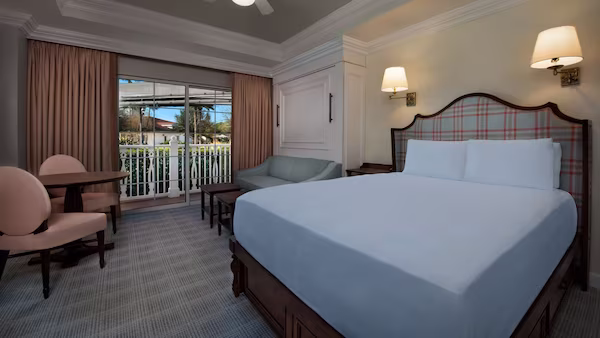 Deluxe Studio Villas feature one full bathroom and accommodate up to five Guests, plus one child under age three in a crib, and include a kitchenette, queen-size bed, queen-size sleeper sofa, one pull-down bunk size bed, flat-panel TV, DVD player and private balcony.